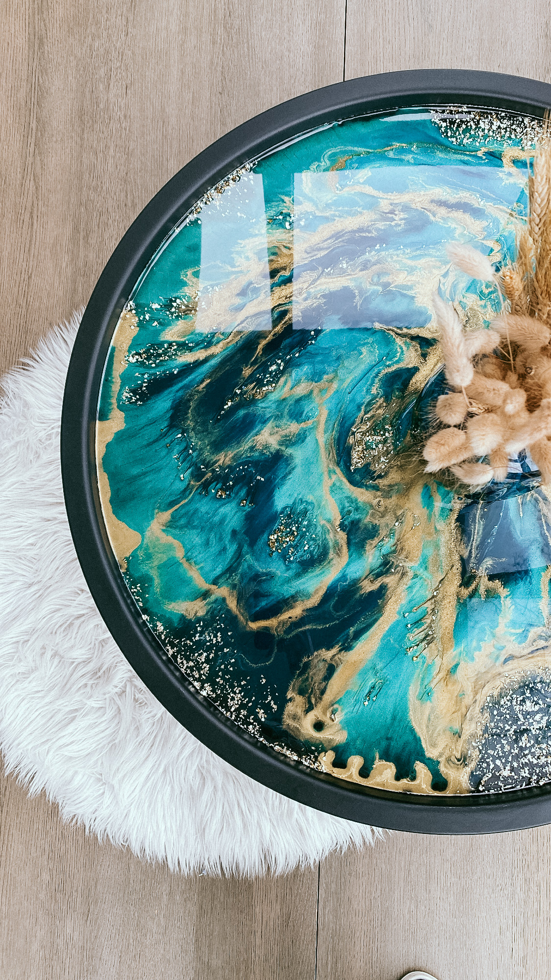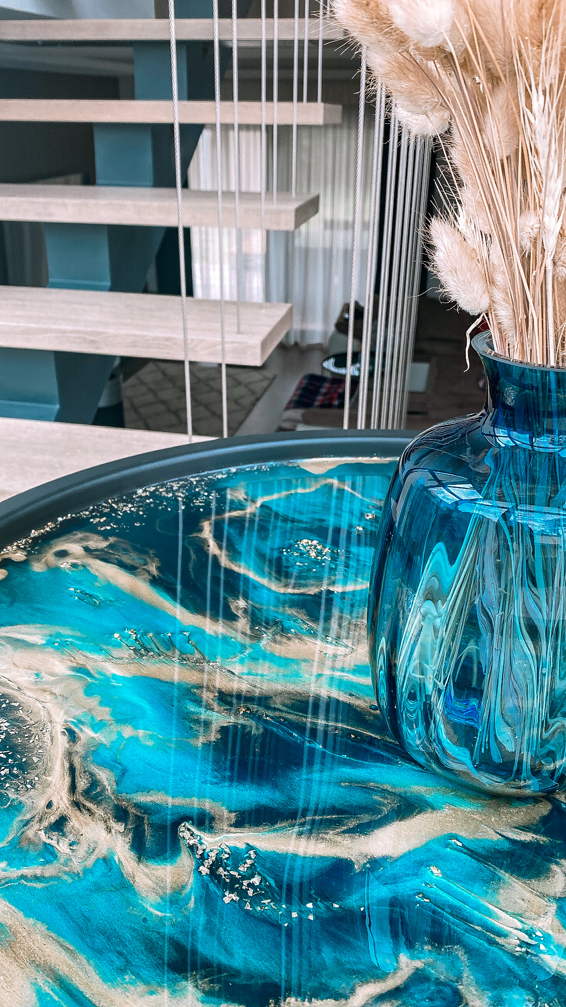 Ez a türkiz-arany dohányzóasztal epoxigyantából, kézzel készült termék, mely egyedi felülete, és színvilága miatt, igazán különlegessé fogja varázsolni otthonodat. Bármit tehetsz rá, amit egy asztalra is például: gyertyát, vázát, kávét, süteményes tálat,de már önmagában is tökéletes kiegészítője lakásodnak. Ha egyedi asztalra vágysz, akkor megtaláltad, mert ilyen biztosan nem lesz senkinek rajtad kívül. :)