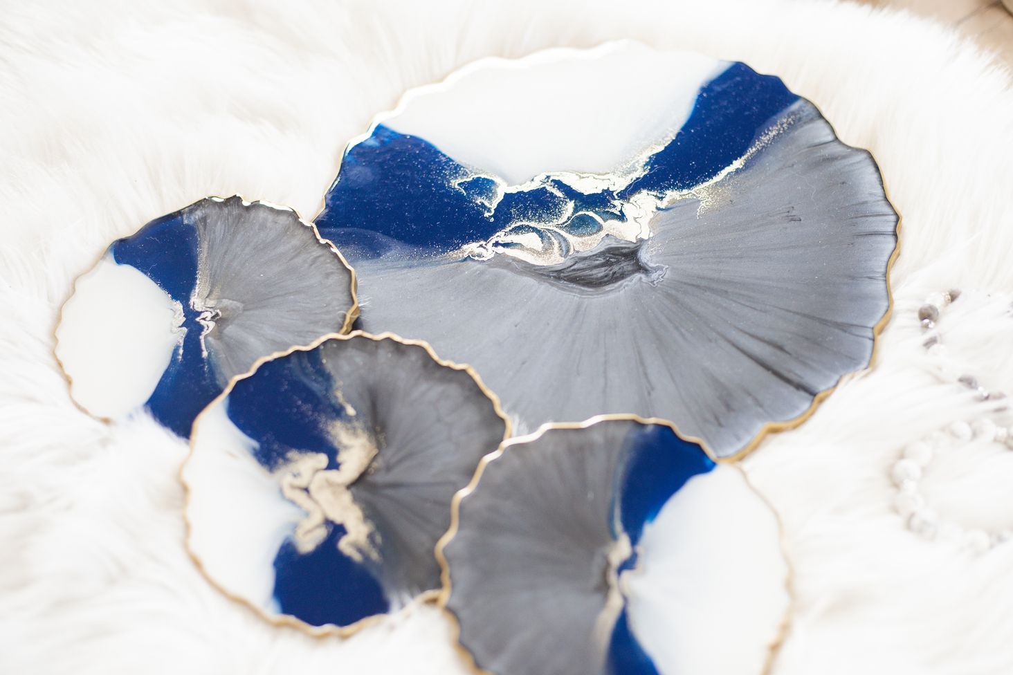 Ez a fehér-sötétkék-szürke kerek formájú tálca és a 3 db hozzáillő poháralátét, epoxy gyantából, kézzel készült termékek, melyek egy kollekcióként vásárolhatók meg. Tehetsz rá például süteményeket, pogácsát, csokoládét, ékszereket, gyertyát, de már önmagában is egy tökéletes dekoráció lehet az otthonodban. Fantasztikus ajándék ötlet bármilyen alkalomra, legyen az születésnap, névnap, esküvő, évforduló, szalagavató, stb.
