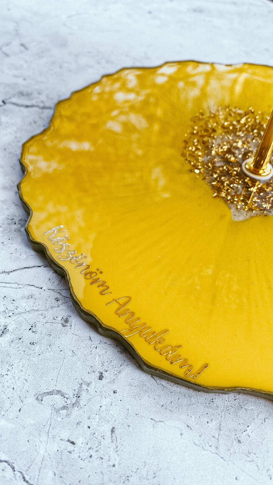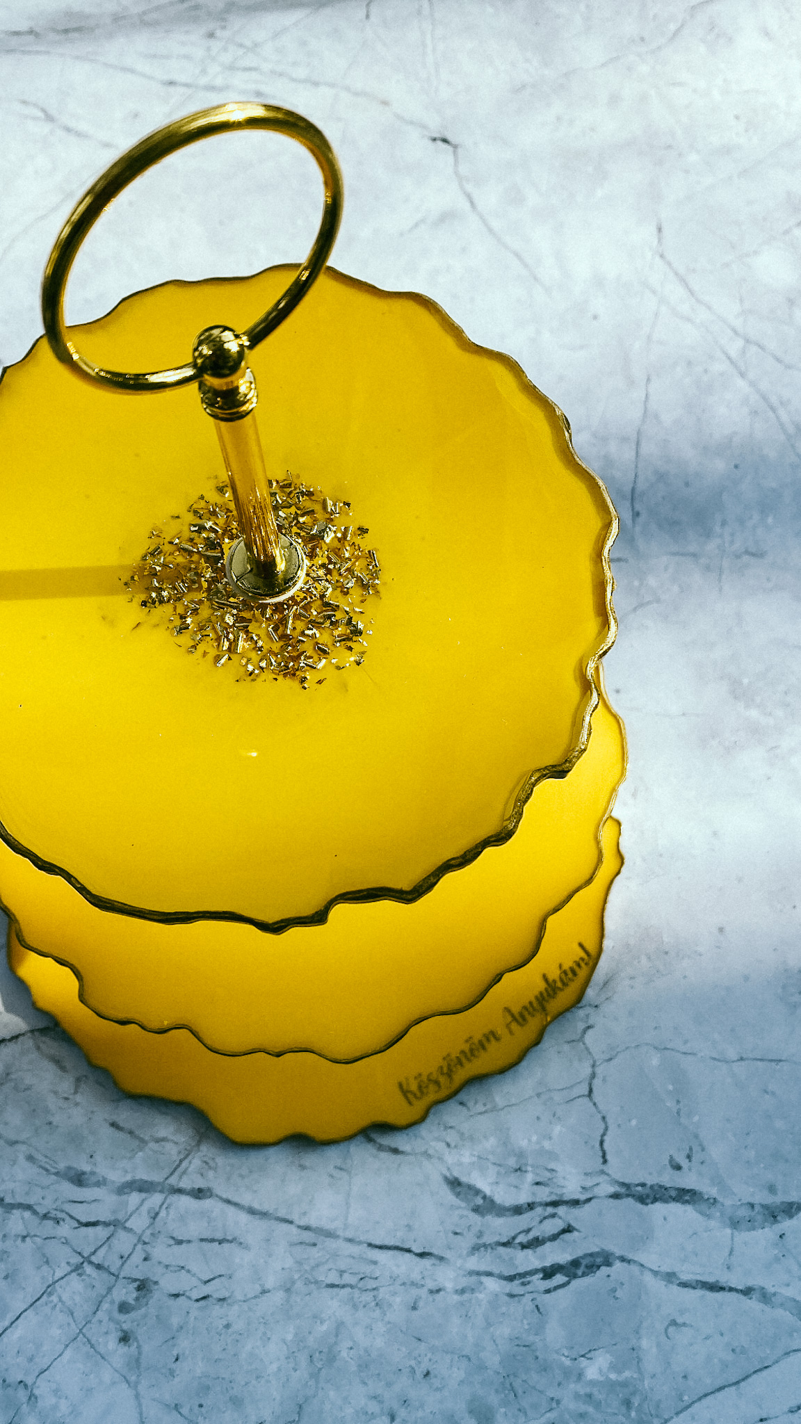 Ez a 3 szintes sütitálca epoxy gyantából, kézzel készült termék, mely egyedi színvilága miatt, igazán különlegessé fogja varázsolni otthonodat. Tehetsz rá például süteményeket, pogácsát, csokoládét, ékszereket, de már önmagában is egy tökéletes dekoráció. Fantasztikus ajándék ötlet bármilyen alkalomra, legyen az születésnap, névnap, esküvő, évforduló, szalagavató, stb.